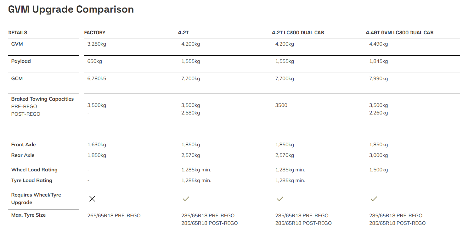 - OEM Factory rim doesn’t have a documented load rating so a rim and tyre package load rated to 1,285kg is required to be compliant with GVM upgrade.
